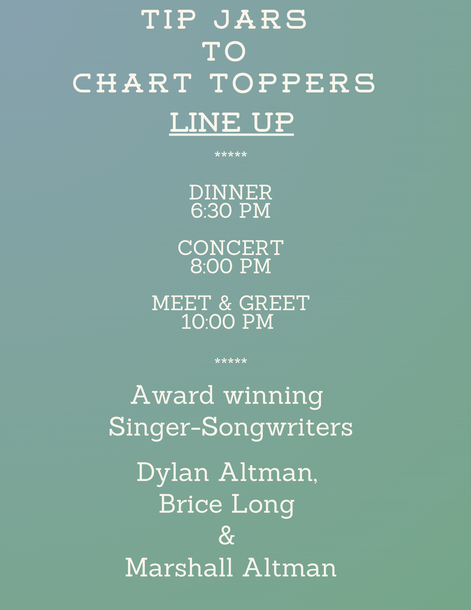 Dust off those Hats and Boots and gather with us at Lake County’s only destination brewery, in the heart of Historic Downtown Long Grove, Il. on October 27th for a night with award-winning singer-songwriters Brice Long, Dylan Altman and Marshall Altman. Tip Jars to Chart Toppers is a taste of Nashville and the stories behind the hit songs.